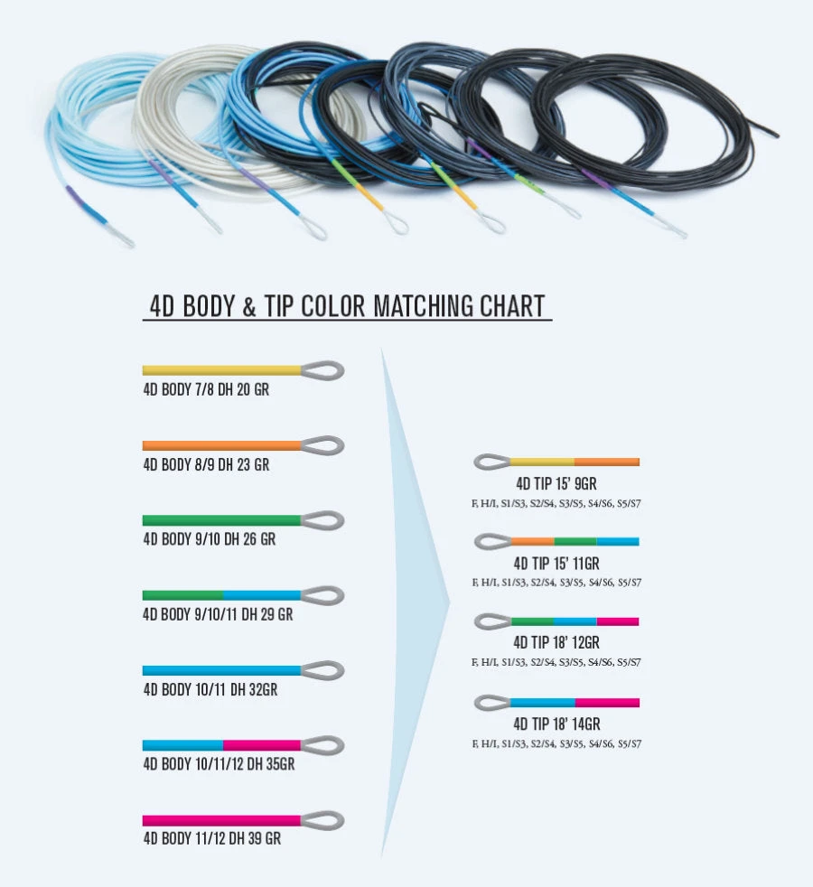 4D Bodies und Tips werden einzeln verkauft, so dass Sie sie nach Ihren Wünschen kombinieren können. Diese Körper arbeiten hervorragend mit unseren 15′ T-Tips zusammen, sind aber auch in Verbindung mit unseren brandneuen 4D Double Density Tips, deren Konizität und Leistung auf unseren Triple Density Linien basiert, hervorragend. 4D-Spitzen gibt es in den Längen 15′ und 18′ und in 4 verschiedenen Gewichten von 9 bis 14 Gramm. Insgesamt gibt es 7 verschiedene Spitzen von Dual Density Floating bis Super Fast Sinking S5/S8 zur Auswahl.